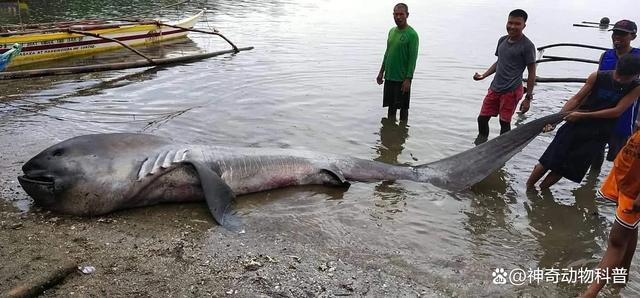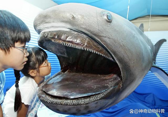 皱鳃鲨又名拟鳗鲛,为一种原始的鲨鱼,是软骨鱼纲六鳃鲨目皱鳃鲨科的皱鳃鲨属下的两种鲨鱼之一。因其腮间隔延长且有褶皱互相覆盖,故名。身体类似鳗鱼,体长可达2米,背鳍、尾鳍与臀鳍均位于身体偏后侧。皱鳃鲨现存数量很少,主要在大西洋和太平洋部分零星地区发现。本鱼大多在水深600至1000米的地方出没,多栖息于深海,分布范围几乎遍及全世界但是十分零散。肉食性,主要吃食其他鲨鱼、鱿鱼和硬骨鱼。可食用,或制成鱼粉。但由于数量稀少,因此被列入中国物种红色名录和世界自然保护联盟濒危物种红色名录。 10、巨口鲨(学名:Megachasma pelagios) 巨口鲨又名巨口鲛、大口鲨,是巨口鲨科巨口鲨属下的唯一现存种,全球至今仅累计约226尾的渔获纪录,其中146只、超过60%的渔获来自台湾花东外海。自1976年第一次目击至2012年间仅55例,相当罕见。巨口鲨头大嘴大,细牙成须状,和姥鲨科及鲸鲨科的鲨鱼一样,以过滤浮游生物为食物;口附近有发光器,可能用来吸引猎物。巨口鲨体长4至5.5米,体重最重可达1吨(1215公斤)。