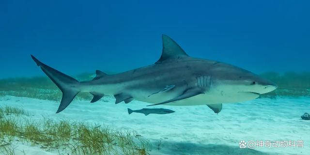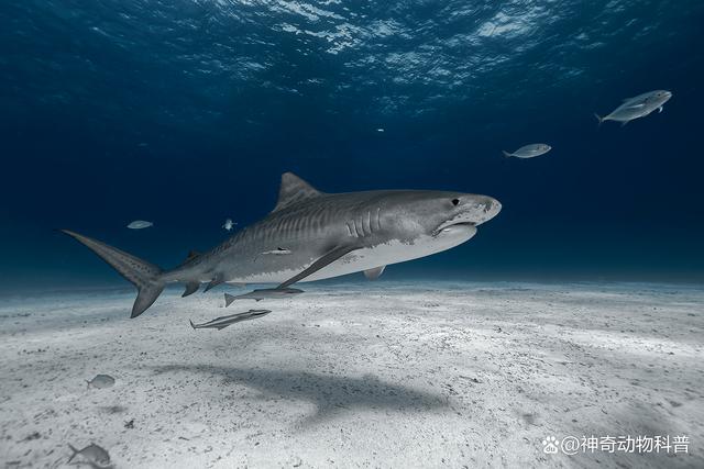 大白鲨中文学名为噬人鲨、食人鯊,又名白鲛、食人鲛、白鲨,俗称白色死神,是一种大型的掠食性鲨鱼,出没于各个主要的大洋,在所有主要沿海表面水域都能找到。大白鲨最早的化石出现于中新世,是噬人鲨属(Carcharodon)唯一现存的成员,属于活化石物种。它的体型引人注目,成年时,体型较大的雌性个体可以长到6.4米以上,体重可达1,905-2,268千克。大白鲨体型庞大,是世上现存最大的掠食性鱼类,为许多海洋哺乳动物的主要天敌,另也会猎食海鸟和其他鱼类等一切能捕杀到的海洋生物。大白鲨与多数鲨鱼相同是机会主义者,于适当时机见到适合的猎物就会攻击,并无所谓理不理想的猎物。相较之下公牛鲨攻击人类的纪录远比大白鲨攻击纪录来的多,甚至有些公牛鲨攻击事件常被误认为是大白鲨攻击。 3、虎鲨(学名:Galeocerdo cuvier)