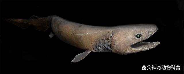 六鳃鲨属是六鳃鲨科下的一个属,皆为生活于深海的鲨鱼,具有宽而钝的头部、六对鳃裂、梳状齿及长尾鳍。体型最大的物种体长可达 8米,体重则能超过 600千克。栖息于大陆棚与深海平原,拥有敏锐的嗅觉,可以和盲鳗、鼠尾鳕等食腐动物在第一时间找到沉落的尸体。原本现存有灰六鳃鲨和大眼六鳃鲨两个物种,但在 2018 年发表了第三个新种 - 大西洋六鳃鲨。它们有一个别的鲨鱼没有的特技,就是能短时间改变身体颜色。由于这种鲨游泳不快,它们就利用这种技能和背景混合起来,然后偷偷靠近游泳快的猎物。 9、皱鳃鲨(学名Chlamydoselachus anguineus)