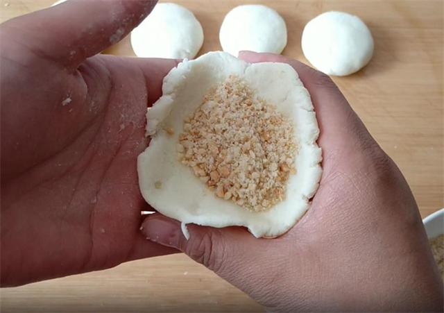 6.接下来我们把面剂先用手揉捏一下,使其变软,这样更容易捏合封口,然后把它捏薄,捏成中间厚边缘薄一点的面皮,包入一勺花生馅,由于这个面不含面筋,所以说它是没有韧性的,用虎口收拢封口,这样更容易一些。
