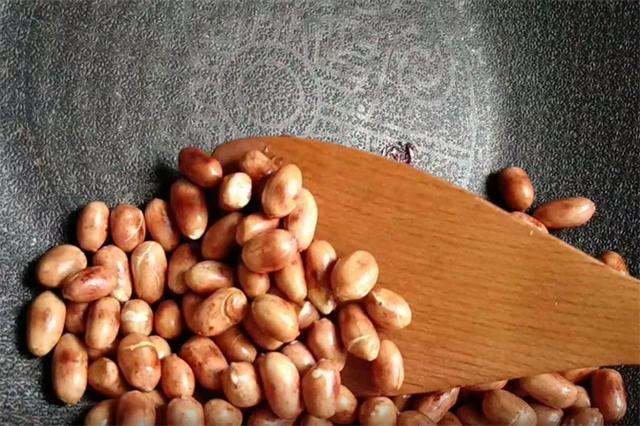 2.接下来我们把花生用清水洗净倒入锅中,然后不停的翻炒,大约炒5到6分钟,炒至花生仁变成微黄色,出锅晾凉。
