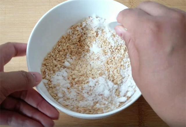 4.接下来我们把花生去皮,然后过滤干净,把花生仁装入袋子中,先用擀面杖把它敲碎,然后再擀成细腻的花生碎,把擀好的花生碎倒入碗中,加入适量的白糖,这个依据个人口味增减,喜欢咸口的也可以放盐搅拌均匀。