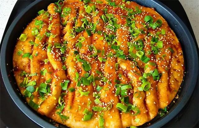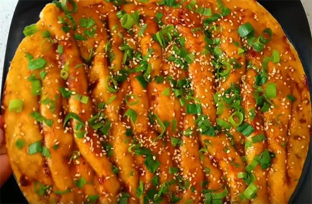 13.然后我们关火,刷上万能酱料,撒上葱花和芝麻就可以出锅了,这样我们千层酱香饼就做好了。