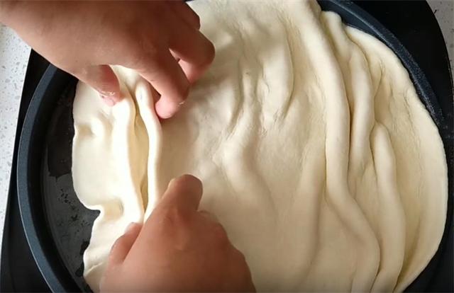 11.然后起锅开小火,油温四成热下入饼坯,然后像这样用手向一面推,这样能够下入更多的饼,而且能够使烙出的饼更加的柔软,更加漂亮,饼坯下入之后直接刷油,盖上盖子焖一分半钟左右。
