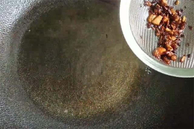 4.接下来锅中放入约60毫升油烧开,下入葱姜蒜末煸炒至褐色捞出,把颗粒状的东西捞出,这样炸出的酱口感更加细腻。