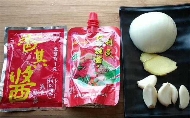 3.然后我们来制作酱料,这是所需要的原料,香其酱一袋,蒜蓉辣酱一袋,葱姜蒜适量,其中圆葱稍微多一些,这样酱料更加鲜美。