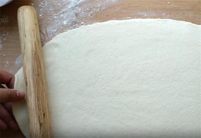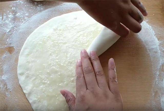 8.接下来我们把面剂揉成圆形的面饼,用手把它按扁,用擀面杖擀成约3毫米厚度的圆形面饼,均匀的涂抹油酥,饼的边缘不要抹,这样防止我们捏合的时候不容易粘连,接下来我们在面皮上切开一个半径,然后像这样旋转,把它卷起。