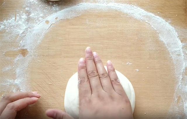 9.一定要捏合边缘捏紧,防止油酥露出,然后用收拢法收紧底部,捏合封口,最后大头朝下,我们把它按扁,这样生坯就做好了。