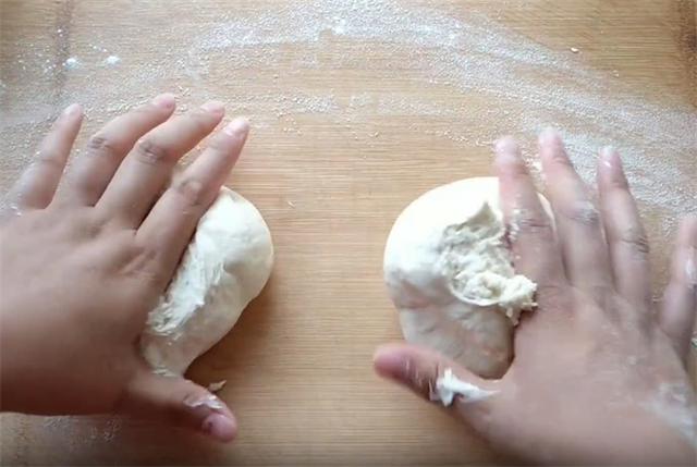 7.然后我们在案板上放一些干面粉,把面团揉搓排气,多揉一会儿,把它分成两个面剂就可以。