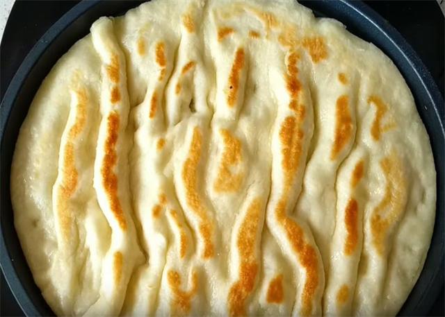 12.时间到我们开盖,大家可以看到这个时候的饼已经鼓起,而且完全变色,基本已经熟了,然后我们翻面,大约再烙制一分钟左右,再次翻面,因为饼比较薄,而且是发面的,所以说很容易熟。