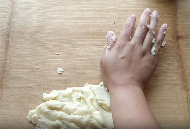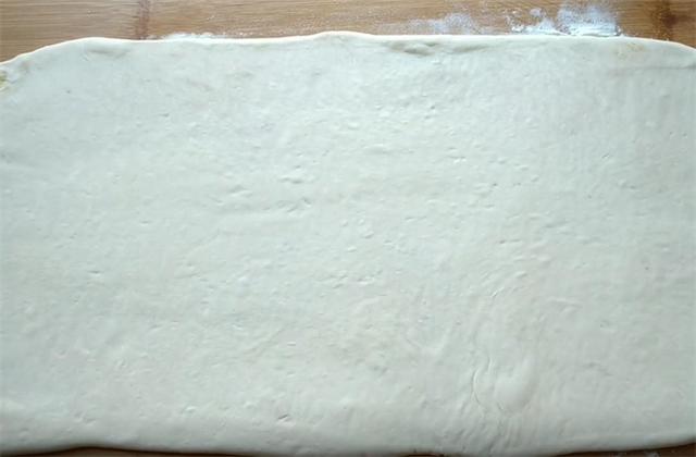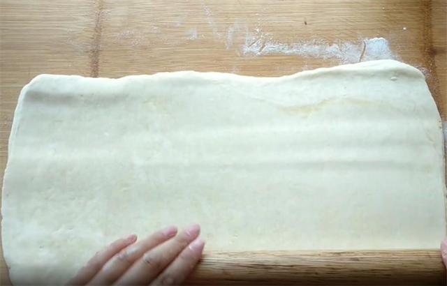 5.再次把它按扁,用擀面杖从中间向两端把它擀成长方形的薄片。