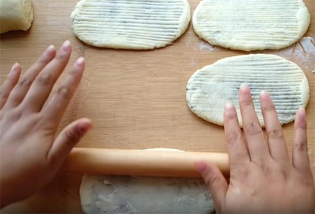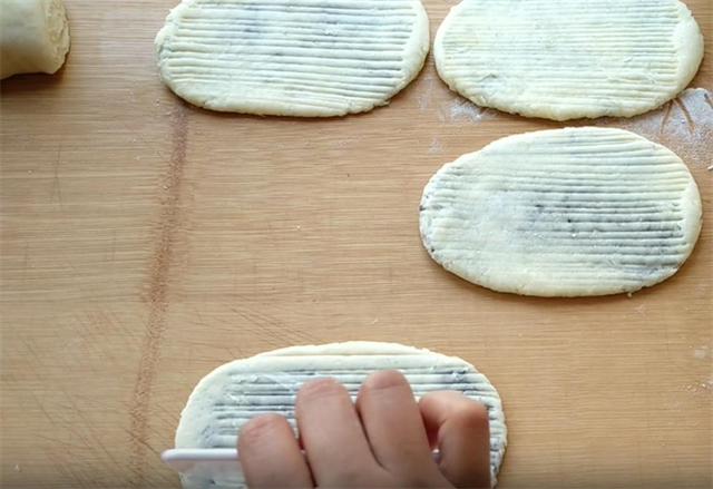 10.由于我们没有做豆沙烧饼专用的那种花纹擀面杖,所以说我们用刮板把它压出纹路,这样更加漂亮。