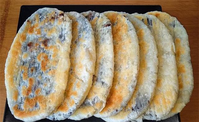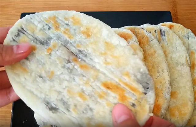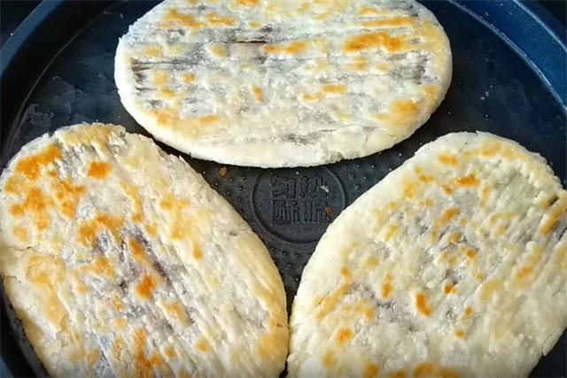 11.所有饼坯做好之后,我们烙制先做好的饼坯,因为基本已经醒发好,起锅开小火放入少许的油即可,本身饼就含有油分,油温四成热下入饼坯,油温过高的话饼坯比较薄,容易烙糊,烙至饼微微鼓起,底面呈微黄色,我们翻面,烙至另一面也呈微黄色,我们再次翻面,由于这个饼坯比较薄,全程约烙制两分半钟,烙至两面微黄即可出锅。