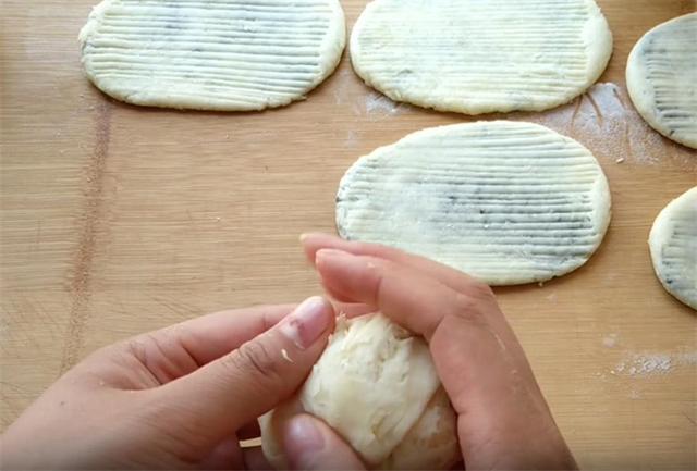8.接下来我们把面剂按成中间稍厚,边缘稍薄一点的面皮,包入豆沙馅,然后用收拢法收口,虎口转动收紧包好的饼皮。