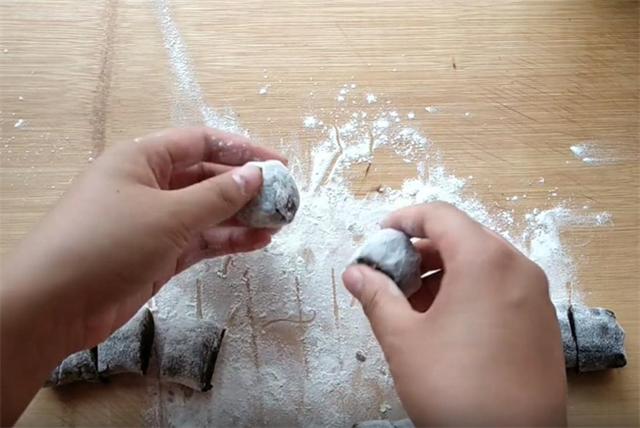 3.接下来我们在案板上倒一些干面粉,然后在豆沙馅上也撒一些干面粉,把它搓成长条,下八个左右的面剂,然后把它搓圆备用。