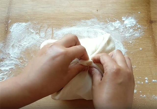 4.在案板上撒一些干面粉,把发好的面稍微揉搓排气即可,不要揉的太久,这样面起筋不容易延展开,然后我们把它搓圆按扁,包入油酥,用包包子的方法收口。