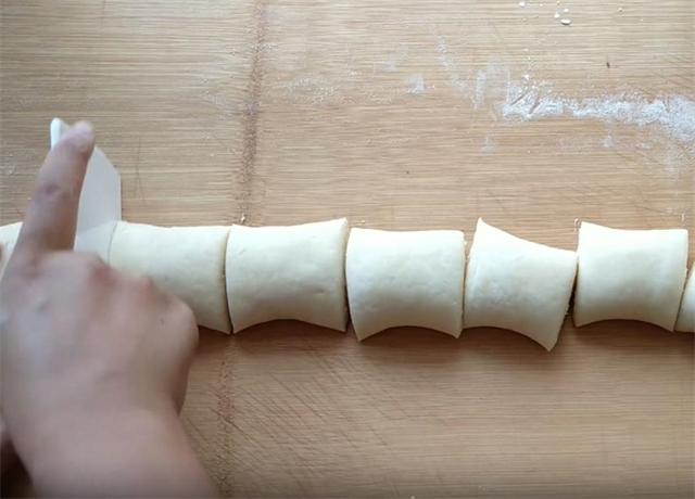 7.我们这种方法叫做大包酥的方法,一般折三次层次就足够薄了,然后把它卷起来,下8到10个左右的面剂。