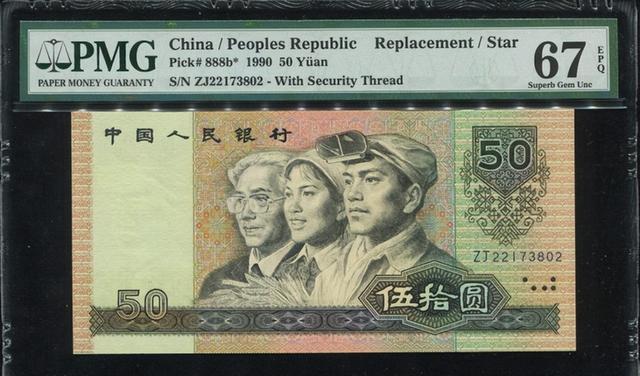 但是90年50元纸币也有一些冠号,上涨超过了10倍,比如说图片中这种ZJ冠号,就达到了600一张,ZJ冠号属于90年50完的补号冠,除了它以外还有JU、JX、ZH、ZI共5个号市价都非高,同时还有一个天蓝冠AR冠。