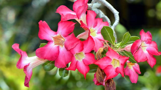 5、沙漠玫瑰沙漠玫瑰,很多人都喜欢养上一盆,从它的名字就可以看出,它是很耐旱的一种植物,生命力强盛,开花时,花朵鲜艳欲滴,比起真正的玫瑰,毫不逊色。但就这么好的植物,唯一怕的就是太过潮湿的土壤和不通风的环境。
