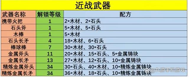 目前游戏中的武器基本上可以分为两类,一类用于生活采集,一类用于战斗伤害。生活类的武器就比较简单了,像下图中的木棒,斧头,稿子等,根据材料的不同制作出来的等级也不一样。在前期阶段,我们可以选择火把,十字镐以及普通斧头作为出行必备。
