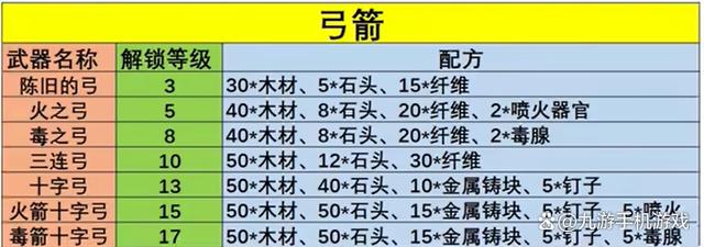 弓箭是属于制作较为简单的武器,通常也是玩家的首选。比较有特色的是火之弓和毒之弓,攻击时可以附带额外伤害。不过这里并不建议大家做这两把,可以直接选择十字弓进行制作,下图中也能看到材料获取难度不大,并且初始攻击有200点可以说是非常优秀了。