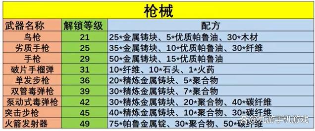 枪械属于较为后期的装备了,制作材料中需要用到一些金属材料,前期不容易获得,起码要45级之后才会比较简单。而使用枪械需要的子弹建议大家不要制作,可以选择去沙漠之镇找对应的商人处进行购买。具体制作方式如下图所示。
