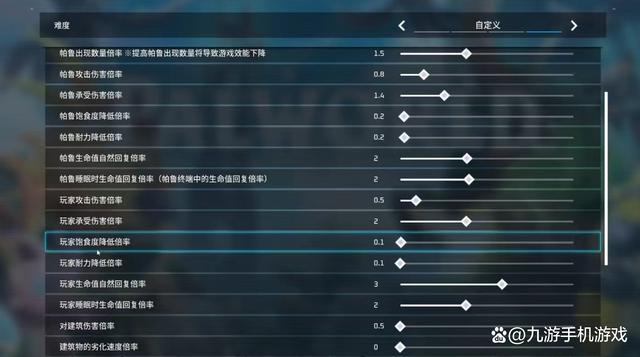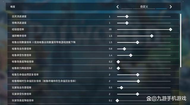 当对游戏有了一定的了解之后就可以。在之前普通难度的基础上进行一些细微调节,例如其他的各项都可以恢复到原有水平,但是捕获概率可以同样维持到2,这样能够增加捕捉到的几率,对于提高体验感是有好处的。另外死亡惩罚可以改成掉落装备以外的道具,这样虽然有惩罚,但在可接受范围之内。最后是为经验丰富的玩家设计,为了让整个世界更有挑战性,可以将各个选项都调成困难,例如提高帕鲁出现倍率到2,承受伤害倍率到0.8,道具掉落为1,可采集物品刷新间隔为2。这样的设计就大大增加了游戏中的困难性,也只有高手玩家才能驾驭。