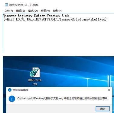 三、实际操作:在Win10中添加公文包 在桌面新建一个文本文件,在其中输入以下内容: Windows Registry Editor Version 5.00 [HKEY_LOCAL_MACHINE\SOFTWARE\Classes\Briefcase\ShellNew] "IconPath"=hex(2):25,00,53,00,79,00,73,00,74,00,65,00,6d,00,52,00,6f,00,6f,00,\ 74,00,25,00,5c,00,73,00,79,00,73,00,74,00,65,00,6d,00,33,00,32,00,5c,00,73,\ 00,79,00,6e,00,63,00,75,00,69,00,2e,00,64,00,6c,00,6c,00,2c,00,30,00,00,00 "ItemName"=hex(2):40,00,25,00,53,00,79,00,73,00,74,00,65,00,6d,00,52,00,6f,00,\ 6f,00,74,00,25,00,5c,00,73,00,79,00,73,00,74,00,65,00,6d,00,33,00,32,00,5c,\ 00,73,00,68,00,65,00,6c,00,6c,00,33,00,32,00,2e,00,64,00,6c,00,6c,00,2c,00,\ 2d,00,36,00,34,00,39,00,33,00,00,00 "Directory"="" "Handler"="{85BBD920-42A0-1069-A2E4-08002B30309D}" [HKEY_LOCAL_MACHINE\SOFTWARE\Classes\Briefcase\ShellNew\Config] "IsFolder"="" "NoExtension"="" 保存后,再将该文件的扩展名改为 .reg。更名时如果弹出警告,选择“是”。