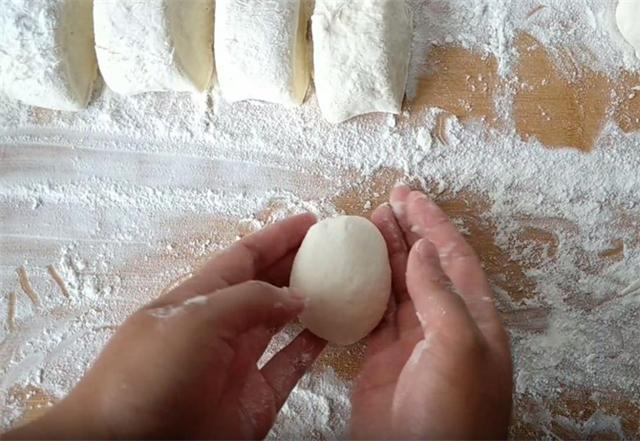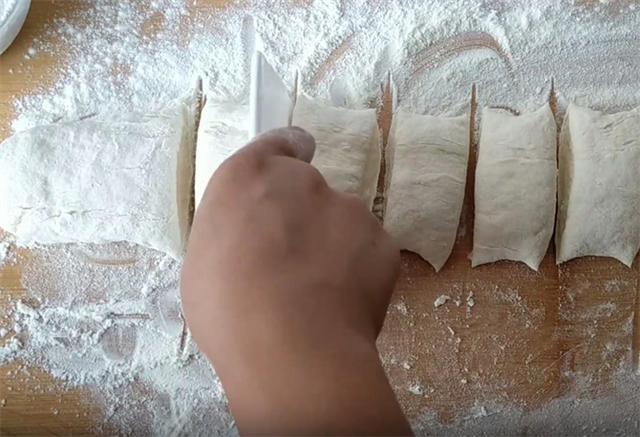 4.接下来我们在案板上多放一些干面粉,把发好的面糊倒在干面粉上,这样防止粘手粘案板,然后利用干面粉把面糊整理成长条形,大约下八个左右的面剂。