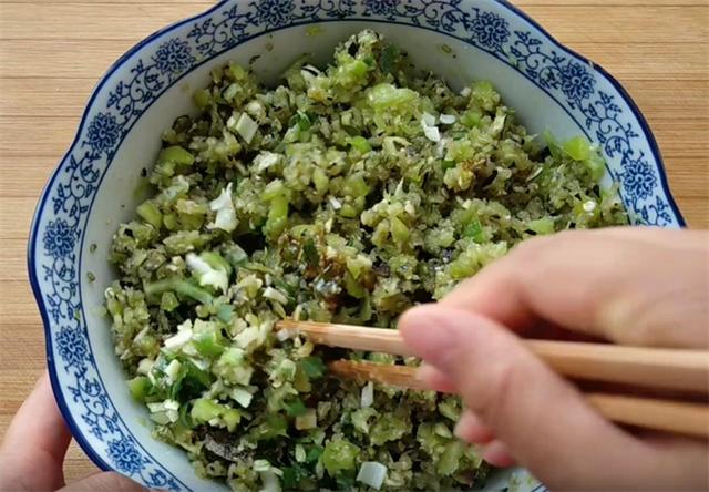 3.打好之后我们攥干水分,打碎之后一定要攥一下,因为水分特别的多,转好之后我们倒入食用油搅拌均匀,这样能够防止加盐之后馅料出水,再加入盐、香油、素蚝油、胡椒粉搅拌均匀备用,我们在调馅料的时候,最好是在面要发好的时候再调。