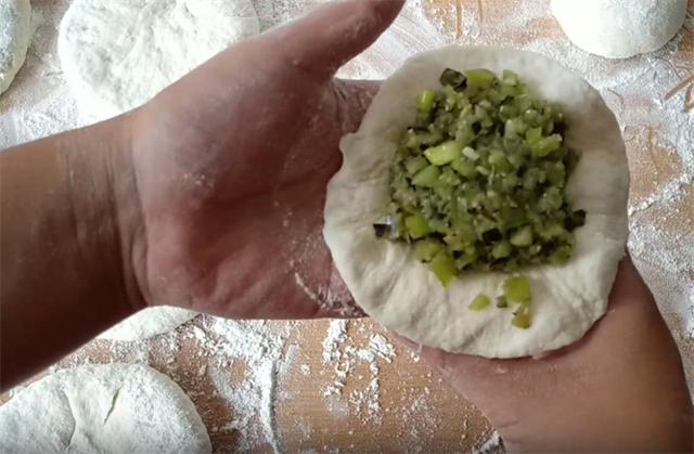 6.接下来把面剂按成中间稍厚边缘薄一点的面皮,包入馅料,按压紧实,用包包子的方法收口,然后揪掉上面多余的面剂,放在案板上轻轻的正反面按压,做好的饼坯要二次醒发五分钟,冬季的话需要醒发十分钟以上。