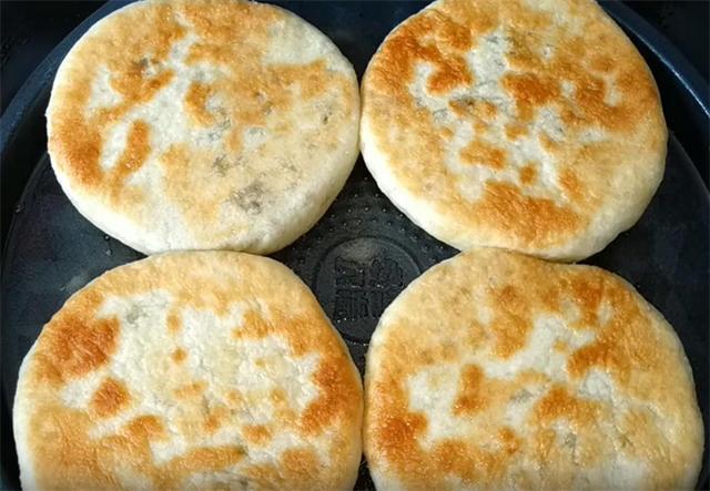 7.我们起锅开小火,油温四成热下入先包好的饼坯,因为醒发的时间相对长一些,烙至饼微微鼓起,底面微黄,我们翻面,因为电饼铛它是中间温度高,边缘温度低一些,大家可以看到我们在翻饼的时候,把温度低的一面重新翻到温度高的这一面,这样烙出的饼表皮颜色程度一致,烙至饼完全鼓起,两面都成金黄色即可出锅,全程大约烙三分钟左右。