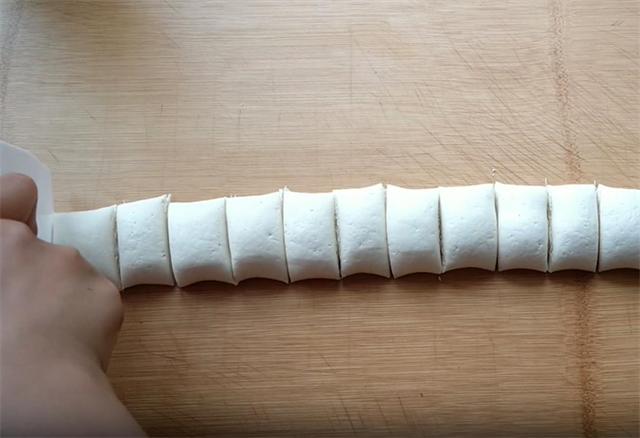 3.大家可以看到面团醒发到这种程度就可以充满了气孔,然后我们把它放在案板上揉搓排气,把它搓成长条形,下12到16个面剂。