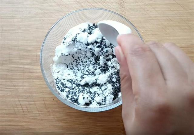 2.接下来我们来调糖馅,白糖50克,黑芝麻两勺,面粉两勺,搅拌均匀备用。