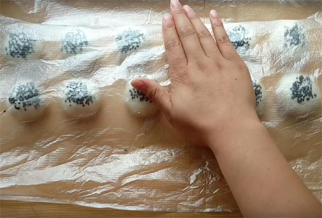 5.然后在做好的生坯上沾上一点点黑芝麻点缀一下,盖上保鲜膜用手轻轻按压,使黑芝麻粘的牢靠,二次醒发10到15分钟,醒发至充满气孔即可。
