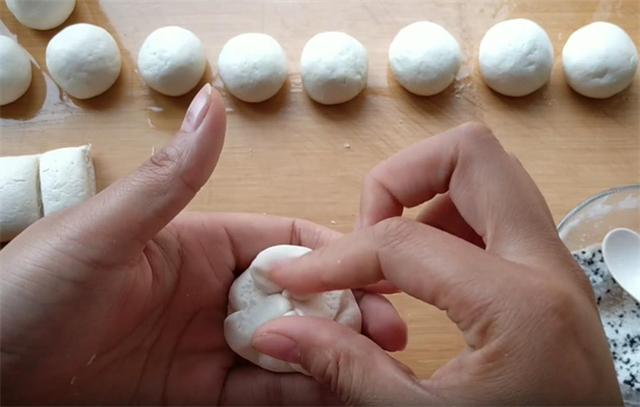 4.我们把面剂用手搓圆按扁,然后再把它捏成中间稍厚边缘稍薄一点的面皮,包入一勺馅料,我们用包包子的方法把它捏紧,然后虎口转动收紧,防止糖馅露出,再用手把它团圆,团到表面光滑即可。