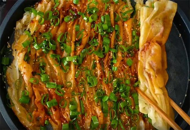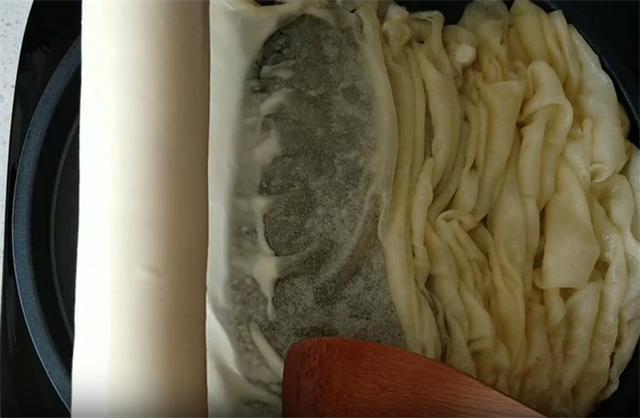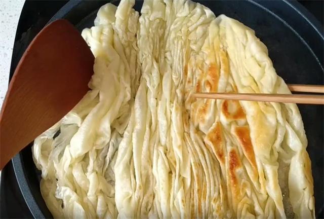 4.我们起锅开小火,油温微热就要下入饼,因为这个饼的层次特别的薄,如果油温过高容易烙糊,然后把烙熟烙变色的部分自然的向后堆积,形成一个褶皱。