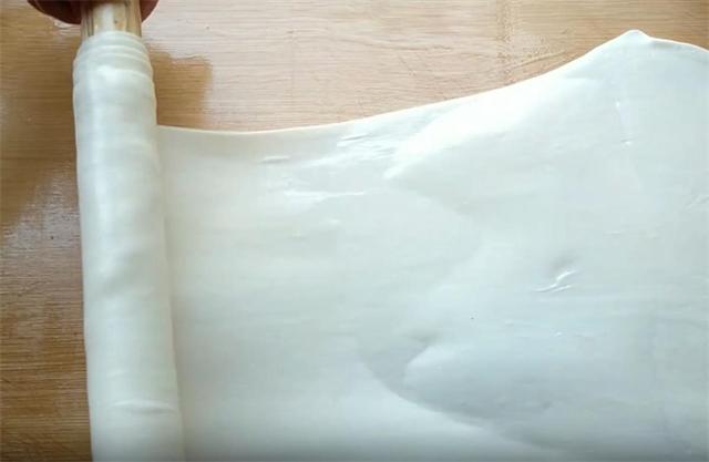 3.案板上一定要抹些油,先按扁,然后再用擀面杖把它擀开,擀的更薄一些,大约擀至1毫米的厚度时,我们在面皮上均匀的刷上一层油,这样防止我们卷起面皮的时候粘连,用擀面杖边向后拉伸边卷起,这样能够使饼皮更加的薄。