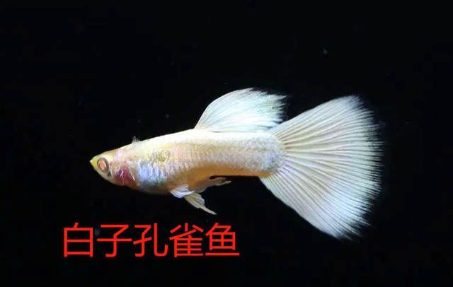 白子孔雀鱼:孔雀鱼的白化物种,有红色的眼睛和透明的白色体色。