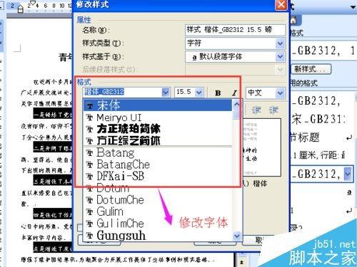 4、在弹出的”修改样式“窗口中,选择”格式“栏中的字体,并更改字体后,点击”确定“。