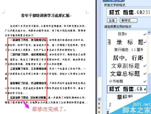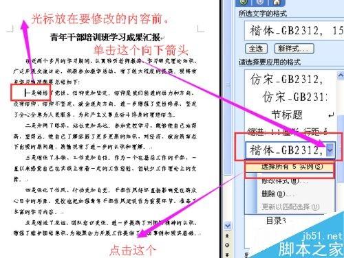 2、在文档的右侧会出现一个“格式和样式”窗口。比如说我更改一下我的小标题,将鼠标的光标放在“一是锤炼了党性,信仰更加坚定”前面。在右侧窗口中选择蓝框中向下箭头,并点击”选择所有5实例“选项。