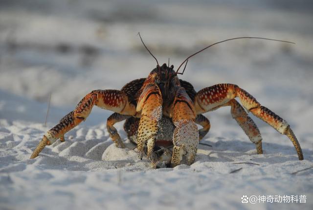 红阿瓦达瓦、红文鸟、草莓雀 (Amandava amandava)。 9、椰子蟹(Birgus latro) 这种令人着迷且坦率地说令人生畏的螃蟹是世界上最大的陆地甲壳类动物(实际上是最大的陆地节肢动物)。它们之所以得名,是因为它们能够打开椰子来吃,并且拥有从地里取出椰子,爬到树上,然后把它扔下来打开椰子并获取里面的果肉的非凡天赋。然而,尽管有这个名字,椰子并不是它们饮食的主要部分,而是主要吃其他肉质水果,以及坚果和种子。