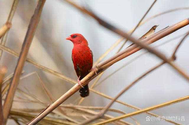 巴哈马比米尼岛爱丽丝镇,柠檬鲨宝宝在红树林中游泳的水下景观。 8、草莓雀 ( Amandava amandava ) 其鲜红色的羽毛上点缀着种子状的白色斑点,很容易看出这种鸟是如何得名的。它也被称为红色阿瓦达瓦特,遍布热带南亚和东南亚。也许并不奇怪,由于其美丽,它作为笼鸟受到收藏家的高度评价。然而,就像许多鸟类一样,只有雄性的羽毛装饰得非常华丽,而雌性则为较为朴素的黄棕色。