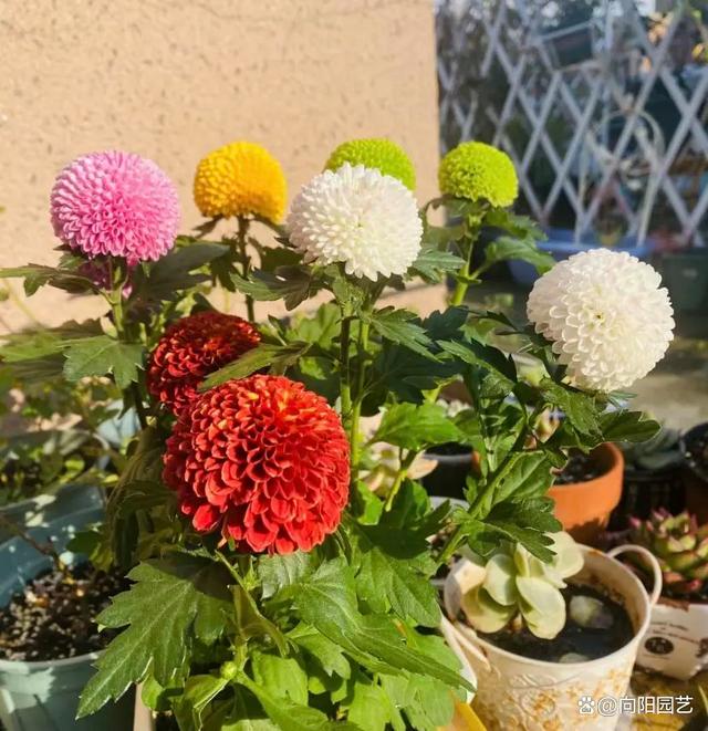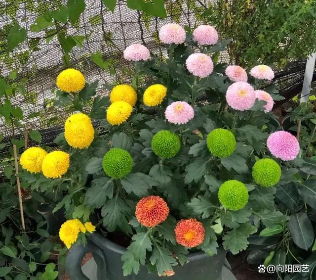 五彩乒乓菊,难道是染色了?并没有,多个品种放在了一起!