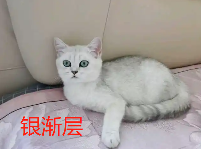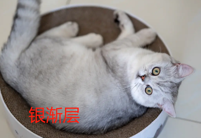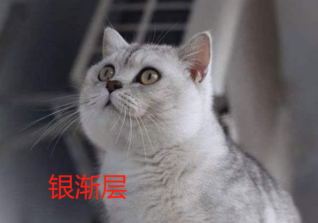 银渐层具有京拉猫白色的毛色和英国短毛的重要特征,底毛为纯白色,背部、两条肋骨、头部和尾部的皮毛尖端被烟熏、灰色和蓝色充分染色,外观呈现出闪烁银色的特征,四肢上有轻微的毛尖染色阴影。面颊、耳丛、腹部和胸部是纯白色的。