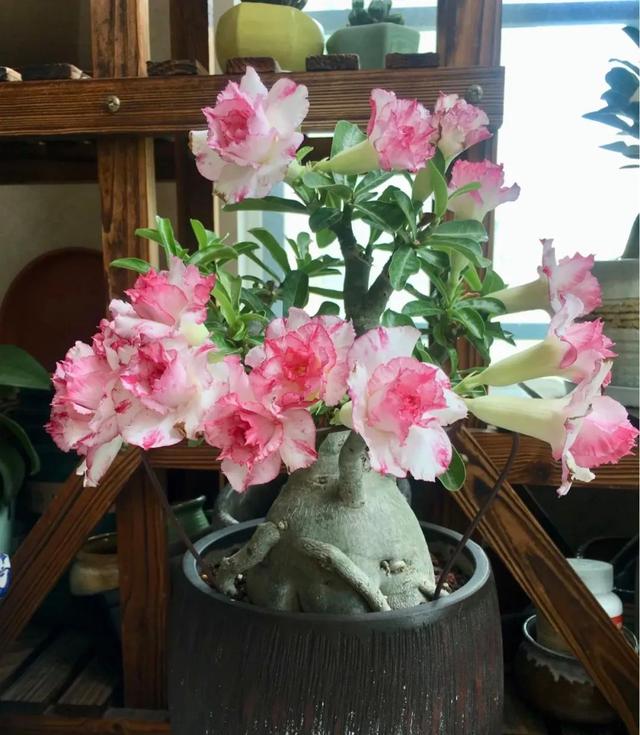 太阳花是一个广为人知的花草,是一种草本植物,花朵就像缩小版的牡丹一样,玲珑精致,华丽高雅,十分漂亮,爆盆时,也会花枝招展,美不胜收。 而太阳花特别好培养,超级能忍受干旱,又特别喜光,是夏天最常见的观赏花,无论是种在庭院里还是培养在阳台上,都能打造出一片风景线。 太阳花要少浇水,茎叶中可以储存大量水分和养分,水多不开,花易烂根。少浇水,控制枝叶的生长速度,就能增加开花量了,一茬接一茬不间断。当然,花盆也不是越大越好,小花盆挤着养,好养还漂亮。 沙漠玫瑰