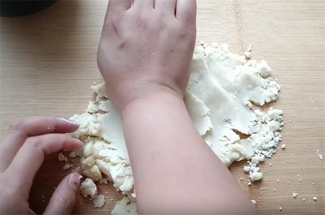 2.接下来我们来制作干油酥,面粉150克,加上食用油75克,面与油的比例约为2比1,这样和出的面团属于干油酥,搅拌至几乎没有干面粉,我们把油酥倒在案板上开始搓酥,这样用手掌反复多搓几次,使油酥更加的细腻,这样更容易擀开,而且面皮不容易破损。(www.Ws46.com)