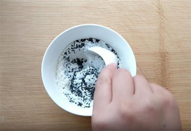 3.我们来准备白糖馅,白糖60克,加入一勺黑芝麻,一勺干面粉,搅拌均匀备用。