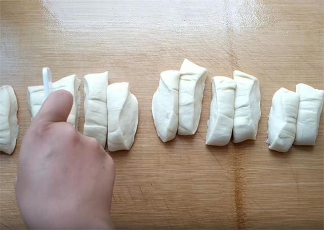 7.然后从中间向两端把面皮擀薄,折3折之后再次从中间向两端擀薄,再折3折,这样我们饼皮就做好了。