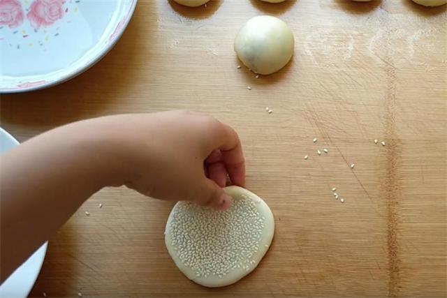 9.做好的饼坯正面沾清水,沾上芝麻,用擀面杖正反面把它擀至几乎可以看到里面黑色的芝麻就可以,饼皮越薄越容易烙制的酥脆,不喜欢芝麻的也可以不放。
